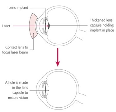 This posterior capsule is almost always clear at the time of the cataract operation and therefore allows light to pass through it and focus on the retina or photographic film at the back of the eye. The posterior capsule can however gradually become cloudy with the passage of time (sometimes many years after the original cataract operation) and you would notice the vision once again becoming gradually more blurred and sometimes glare symptoms. . The treatment is to make a central hole in the posterior capsule with laser. It is called a YAG laser capsulotomy after the type of laser required to create the hole.