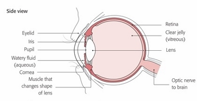 There are two lenses in the camera, the cornea which is the clear window at the front of the eye (where contact lenses are placed) which is the main focus for light (but cannot change its focus) and the lens that is inside the eye called the crystalline lens which is the fine focus and can also change its shape to change the focus to enable us to see distance (to the horizon) and near (for reading and writing). The crystalline lens is the only organ in the body that keeps getting bigger as we grow older and as it gets bigger its ability to change shape and alter focus for near objects diminishes. This is why we need to wear reading glasses when we get into our forties or fifties and also the reason it often goes cloudy (a cataract) in our sixties and onwards and requires surgery to remove the cataract.